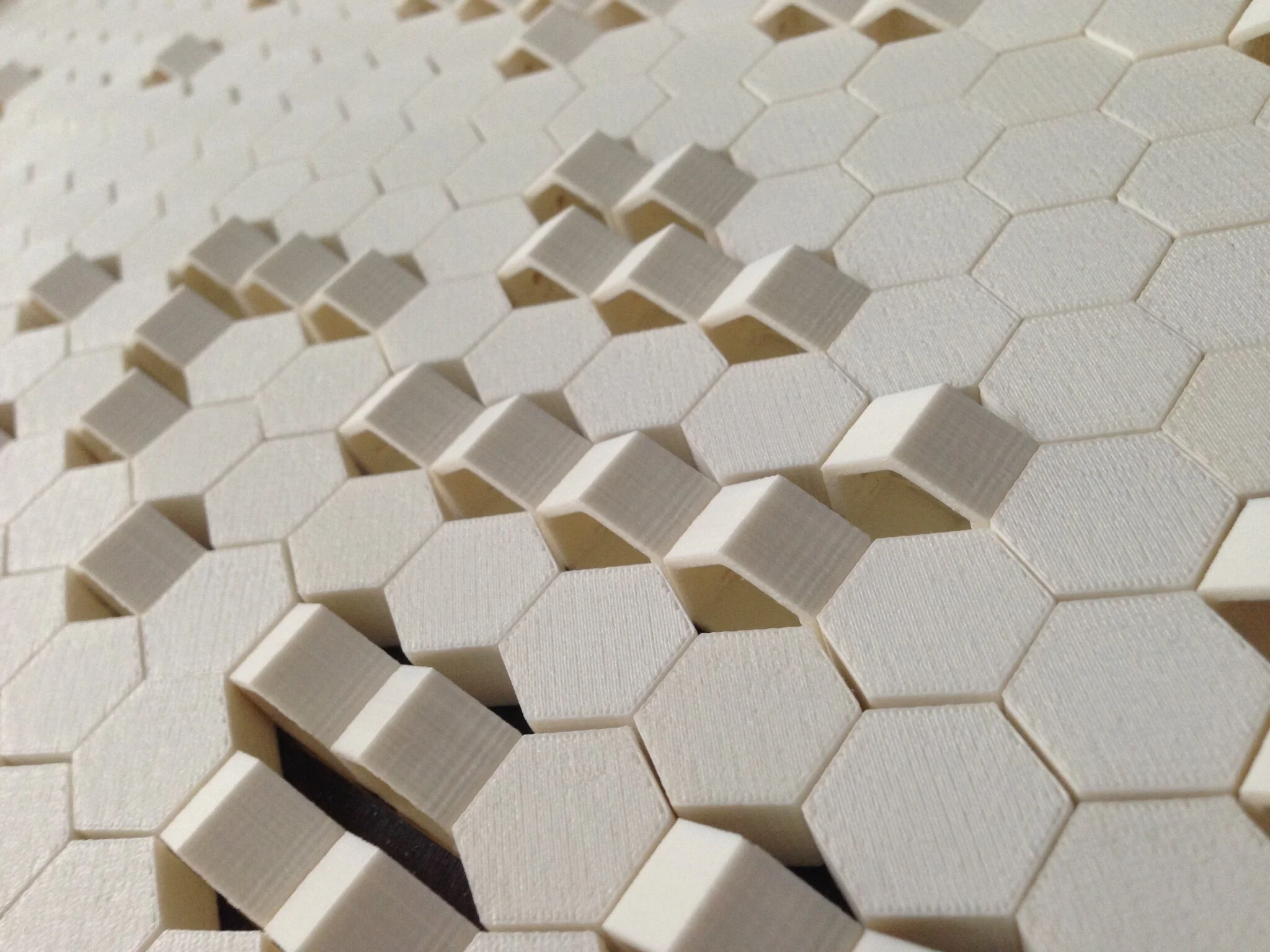 As part of my research, I had designed physical tokens that could connect to each other and support mapping at the required variables of a binary system. As one of the main objectives of this research study was to create an adequate system flexible enough to map different data sets and to support the concept of constructive visualisation, I started to design the system before choosing any data set. I used hexagons as an example of more general tessellation geometry to design a token and constraint system that could grow in different directions and create a vibrant physical pattern. To address these requirements; the system needed to be dynamic and flexible enough to use physical tokens to map data, and to be modified, updated, and manipulated when needed.